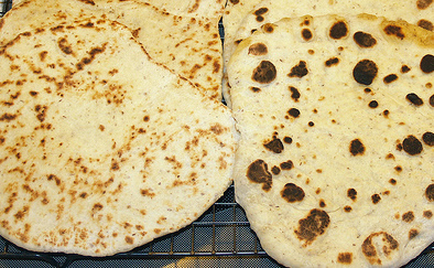Cook the nans Pull the nan bread into a pear shape and slap on to a hot griddle, and cook for 45 seconds until the bottom is cooked and has brown flecks. Using a fish slice transfer the nan under a hot grill and cook the top for 1 to 2 mins until golden brown. Cook the remaining nans and keep wrapped up in foil or a clean kitchen towl to keep warm and moist. | |