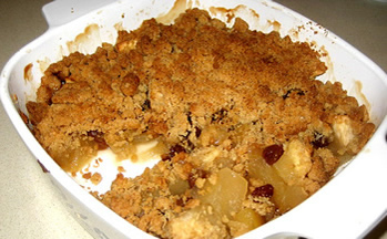 Sprinkle the crumble over the apples and spread out lightly with a fork. Bake in the oven at 180° C for 30 to 40 mins until the crumble is nice and crunchy. |